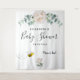 Elegantes, klassisches, modernes Baby-Duschbanner im Blumenstil, Tapeten. Weiße, wasserfarbene Bauern, Blume mit Blumen und Eukalyptusgrün. Mit dem Text: Babydusche geschrieben mit einem großen, modernen, schwarz gefärbten Handschrift. Personalisieren und fügen Sie den Namen der Mutter zu sein, und ein Datum. Kann als Begrüßungsbanner, Wanddekoration für die Babydusche oder als Foto verwendet werden. Geschlechterneutral. Mit einer niedlich glücklichen lächelnden Biene und dem Text: Mama zu sein!