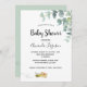Geschlechterneutral, für eine Mutter, Mutter zu sein. Ein schick weißer Hintergrund. Weiße Eukalyptus-Pflanzen, Blätter und Sprigs, eine niedliche, glückliche Biene mit einem Umschlag. Personalisieren und fügen Sie einen Namen und Party-Details hinzu. Schwarze Buchstaben. Der Text: Baby Shower und der Name der Mutter zu sein geschrieben werden mit einem modernen handgeschriebenen Stil Skript. Zurück: grüne Hintergrundfarbe und die glückliche lächelnde Biene.