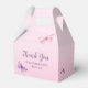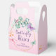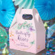Schöne Butterfly Theme Mini Gable Gefälligkeitsbox mit rosa, lila, orangefarbenen und minzgrünen Schmetterlingen und einem goldenen Imitat mit Eukalyptus-Akzenten. "Butterfly Kisses" Zitat und sanfter rosa Farbverlauf auf einer niedlichen Gunst-Box perfekt für eine skurrile und moderne boho Babydusche für ein kleines Mädchen.