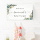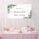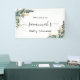 Für eine moderne und elegante Babydusche, geschlechtsneutral. Ein schick weißer Hintergrund. Dekoriert mit grünen Aquarellen Eukalyptusbäumen, Blätter, Grünpflanzen und vergoldeten Imitaten. Personalisieren und einen Namen hinzufügen. Mit dem Text: Willkommen in der Baby Dusche. Kann als Begrüßungsbanner oder als Party-Wanddekoration verwendet werden. Der Name wird mit einem angesagten, handgeschriebenen Stil-Skript mit Swashes geschrieben. Um die Swashes behalten, löschen Sie nur den Beispielnamen, verlass die Leerzeichen oder Emoji's vor und nach dem Namen.