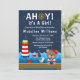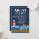 Diese niedliche und unterhaltsame Einladung beinhaltet einen nautischen Seemannsbär auf einem Holzdeck mit einer Möwe und einer Krabbe. Im Hintergrund befindet sich ein roter und weißer Leuchtturm, ein niedlicher Vogel auf einem Segelboot, Meereswellen und ein marineblauer Sternenhimmel. Der Text verbindet fett- und serifenlose Schriftart für ein stilvolles und modernes Aussehen. Das ist ideal für eine Babydusche zum Thema Wassersport.