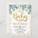 Einladung der Babydusche. Botanisches Design mit grünen Blätter und Imitaten Glitzer Gold. Enthält Skript-Schriftart und Konfetti-Punkte. Nachricht, wenn Sie weitere Anpassungen benötigen.