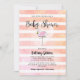 Weich, Aquarell, gürtelfarbene Korallen und weiße Streifen Hintergrund, feiert eine Babydusche. Niedlich, rosa, Flamingo mit Muscheln aus weißem Marmor, Hintergrund knapp unterhalb des Textes "Babydusche".