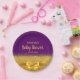 Eine elegante und glamouröse geschlechtsneutrale Babyduschplatte. Trendige violette, lila und goldene, funkelnde Hintergrundfarbe mit einem Imitat goldenes Band und Bogen. Vorlage für den Namen der Mutter, das Datum der Babydusche und den Text: Baby Dusche. Goldene Buchstaben.