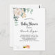 Für eine Babydusche, geschlechtsneutral. Ein schick weißer Hintergrund. Die Einrichtung besteht aus weißer, wasserfarbener Rose, Blume, blühender und grüner Eukalyptusgrün, Blätter, einem goldenen Gewürz und einer niedlichen, glücklichen Biene, die einen Umschlag trägt. Personalisieren und fügen Sie einen Namen und Party-Details hinzu. Schwarze Buchstaben. Der Text: Baby Shower und der Name der Mutter zu sein geschrieben werden mit einem modernen handgeschriebenen Stil Skript. Zurück: Postkartendesign. Tipp: Wenn Sie es nicht so gewollt haben, dass es wie eine Postkarte aussieht, klicken Sie auf Anpassen, gehen Sie auf die Rückseite und entfernen Sie den Trenner und posten Sie die Briefmarke.