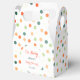 Baby Shower Fevor Box mit farbenfrohen Punktmustern im Hintergrund und Text für Personalisierung