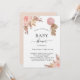 Für eine moderne Babydusche im bohischen Stil. Weißer Hintergrund auf der Vorderseite. Rose mit goldenen und rosa Blumen, Rose, Pampas-Gras und ein Teddybär mit rosa Ballon. Personalisieren und fügen Sie einen Namen und Party-Details hinzu. Zurück: Eine Rose goldener Hintergrund.