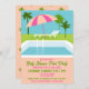 Eine Einladung für ein Party mit Babydusche. Mit einer Grafik von einem Swimmingpool, Liegestühlen, Sonnenschirm und Palmen. Eine moderne Einladung mit tropischen Sommerhitzen, die leicht personalisiert werden können.