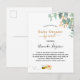 Für eine Babydusche per Post. Ein schick weißer Hintergrund. Mit Eukalyptus-Grün dekoriert, verlasse ein Imitat goldene Zitrone und eine niedliche glückliche lächelnde Biene mit einem Umschlag. Personalisieren und fügen Sie einen Namen und Party-Details hinzu. Schwarze und goldene Buchstaben. Der Text: Baby Shower und der Name der Mutter zu sein geschrieben werden mit einem modernen handgeschriebenen Stil Skript. Geschlechterneutral. Zurück: Postkartendesign. Tipp: Wenn Sie es nicht so gewollt haben, dass es wie eine Postkarte aussieht, klicken Sie auf Anpassen, gehen Sie auf die Rückseite und entfernen Sie den Trenner und posten Sie die Briefmarke.