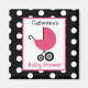 Eine Babydusche mit einer Abbildung eines rosa Rollers über einem Hintergrund aus schwarz mit weißen Polka-Punkten. Personalisieren Sie mit Ihrem Namen.