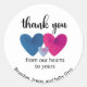 Ein runder Aufkleber mit Mama, Papa und Baby Aquarellherzen. "Danke von unseren Herzen bis zu deinen." Siegel einer Gefälligkeitstasche oder der Rückseite eines Dankeschön-Kartenumschlag.