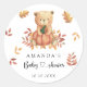 "Babydusche". Feiern Sie mit diesem Teddy Bären Thema Baby Dusche Party! Der niedliche Teddybär mit einem Herbstkürbis in seinen Pfoten sitzt im Herbstwald.