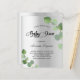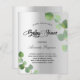 Eine moderne, elegante, geschlechtsneutrale Babydusche. Imitate silberfarbene, metallische Untergrundfarbe mit Eukalyptusgrün, Sprigs. Personalisieren und fügen Sie einen Namen und Party-Details hinzu. Schwarze Buchstaben.