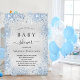 Eine moderne, elegante Babydusche, die einen kleinen Jungen feiert. Imitate silber metallische Hintergrund mit blauen Imitaten Glitzer Staub. Personalisieren und fügen Sie einen Namen und Party-Details hinzu. Schwarze Buchstaben.