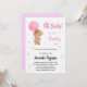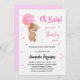 Für eine Babydusche, die ein Babymädchen feiert. Ein weißer Hintergrund mit rosa Sternen. Ein Teddybär, der einen rosa Ballon hält. Personalisieren und fügen Sie den Namen der Mutter zu sein und Party-Details. Oh Baby! und Bearly sind mit einem handgeschriebenen Stift geschrieben.