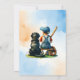 Braun und Blau personalisierte Jungen's Baby Dusche Einladungen mit einem kleinen Jungen sitzend neben einem Hund, ein Black Lab mit Baseball-Thema.