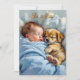 Eine niedliche Babydusche für eine Kinderdusche. Ein süßer Neugeborener, der mit seinem kleinen Welpen ein Nickerchen nimmt. Die Farben sind blau und braun für diese Einladung.