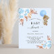 Für eine moderne Babydusche im bohischen Stil. Hellblaue Hintergrundfarbe Die Einrichtung besteht aus hellblauen Blumen, Rose, Pampas-Gras und einem Teddybären, der einen blauen Ballon hält. Personalisieren und fügen Sie einen Namen und Party-Details hinzu.