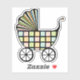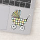 Ein Spaziergang durch diesen lustigen, stilvollen Kinderwagen, der mit hellen rosa, orangefarbenen, grünen und blauen Streifen auf dem Cover und einem Muster, das an Holzblöcke auf dem Körper erinnert, geschmückt ist.