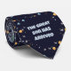 Ein Vater, der eine Babydusche feiert, trägt eine skurrile Krawatte, die mit Sternen und Planeten geschmückt ist und sich seiner neuen Rolle mit Freude bewusst ist.