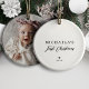 Celebrate your little one's first holiday season with this personalized baby’s first Christmas ornament, designed to be a timeless keepsake you’ll treasure for years to come. The front features a minimalist layout with elegant black typography on a crisp white background, combining classic serif and modern script fonts for a sophisticated look. A small heart icon and customizable year complete the clean, stylish design, making it a perfect addition to any Christmas tree, whether your style is traditional, modern, or rustic. The reverse side includes space for a full photo, allowing you to showcase your baby's sweet face and capture the joy of their first festive season. Whether you’re buying for your own baby or gifting to new parents, grandparents, or godparents, this high-quality printed ornament creates a heartfelt moment that will be remembered every year when decorating the tree. Ideal for celebrating new arrivals and first-time parents, this ornament also makes a thoughtful baby shower or holiday gift, preserving the magic of a newborn’s very first Christmas in a beautiful and lasting way.