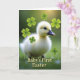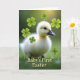 This card shows a fluffy pale yellow chick centered against a softly blurred green backdrop, giving the scene a gentle spring setting. The chick’s tiny dark eye angles toward a warm golden glow in the upper right, like it’s sharing a quiet, affectionate glance with the light. Around it float several bright green four-lobed leaf shapes, some sharp and some faded into the background, adding a sweet, friendly mood 🌷. The lighting stays soft and golden, highlighting the chick’s down and creating a cozy contrast with the cool greens behind it. Along the bottom, the phrase “Baby’s First Easter” appears in large gold letters with a luminous look, standing out clearly against the darker edge of the scene. The text is centered near the lower border, leaving the chick unobstructed and making the message easy to read. A few of the green leaf shapes drift near the chick’s head and shoulders, while others fade into the distance like soft bokeh 🐇.