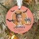 Das erste Halloween-Kürbisbats-Foto des Babys - Glasschmuck. Der Name eines Babys in einem modischen Skript, orangefarbene Kürbis und schwarze Fledermäuse. Personalisieren Sie das Ornament mit dem Foto, dem Namen und dem Jahr Ihres Babys. Ein schöner Halloween-Feiertag.