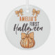 Das erste Halloween-Kürbiskürbis-Glas-Ornament des Babys. Der Name eines Babys in einem modischen Skript, orangefarbener Kürbis mit niedlichem Bogen und orangefarbenem Bogen. Personalisieren Sie das Ornament mit dem Namen Ihres Babys. Ein schöner Halloween-Feiertag.