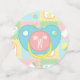 Vier Quadrate in sanften Pastellfarben in Rosa, Grün, Blau und Gelb sind von einem weißen Design wie Stich-Markierungen gerahmt und mit niedlichen, babythematischen Ikonen einer Flasche, Windel, Rattle und Bib dekoriert. Jedes Stück Konfetti hat einen Schnuller-förmigen Monogramm-Bereich auf der Rückseite, wo Sie es mit dem ersten Baby anpassen können, um eine wirklich einzigartige Party-Dekoration für Ihre Babydusche zu schaffen. Dieser Konfetti wird mit jedem anderen Baby's Quilt Produkt übereinstimmen, sodass Sie Ihre Veranstaltung so koordiniert gestalten können, wie Sie es wünschen.