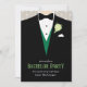 Eleganter Grafik-Bräutigam in Tuxedo und grüner Weste und eine Single grün Rose Bachelor Party Einladung. Bearbeiten Sie diese Einladungen mit Ihren eigenen Worten, dem Namen der Zeltgruppen und den Details zu den Veranstaltungen vor der Hochzeit. © Einzigartiges Design und grafische Kunst von Sarah Trett. www.sarahtrett.com für www.mylittleedenweddings.com