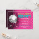 © Socialite Designs Inc. Feiern Sie den zukünftigen Junggeselinnen-Abschied, indem Sie diese lustigen pink und silber Disco-Ball-Party Einladungen verschicken. Passen Sie den Text für Ihr Ereignis einfach an, indem Sie den Vorlagentext ersetzen. Das Design besteht aus einer silbernen Diskokugel, rosa Hintergrund mit Reflexionen und Sternexplosionen, die verschoben und verkleinert werden können. Der Text ist so gemacht, dass er wie Neonleuchten aussieht.