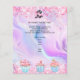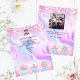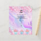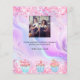 Personalisieren und fügen Sie Ihr Firmenlogo, Ihren Namen, Ihre Adresse, Ihren Text. Rosa, lila, blauer pastellfarbener holografischer Untergrund mit Konfetti und Kuchen. Zurück: Fügen Sie ein Foto hinzu und erzählen Sie die Geschichte über Ihre Marke.