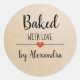 Moderner Aufkleber "gebacken mit Liebe" mit schwarzem Schriftart auf einem Pappboden, der durch ein niedliches rotes Herz geschmückt ist. Text anpassen.