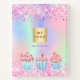 Ein trendiger holografischer, rieszierender Hintergrund in Rosa, lila, Rose Gold, Minzgrün. Dekoriert mit Imitaten Glitzer Staub in Rosa und 3 Kuchen. Personalisieren Sie Ihr Firmenlogo, Text, Jahr und Ihren Firmennamen und fügen Sie es hinzu. Der persönliche Name wird mit einem modernen handgeschriebenen Stilskript geschrieben.