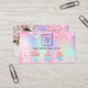Ein rosa, lila, minzgrüner holografischer Hintergrund. Die Einrichtung ist mit rosafarbenen Imitaten aus Glitzer und Kuchen geschmückt. Personalisieren Sie Firmenlogo und Text auf der Vorderseite. Zurück: Vorlagen für Ihr Profil Foto, Name, Titel, Telefonnummer, E-Mail- und Website-Adresse, Ihren eigenen QR-Code für Ihre Website oder Ihr Social-Media-Konto.