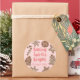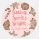 Niedlicher Weihnachtsaufkleber für Bäcker mit handgezeichneter Illustration von Feiertagskeksen mit Text, der "Backgeister hell" sagt. Sie können dies als Geschenkgutscheine oder für Ihr Cookie-Swap-Party verwenden. Der Hintergrund ist rosa.