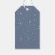Baking Spirits Bright weiße Typografie zitieren blaue Feiertagsgeschenke Tags. Auf der Rückseite des Tags befindet sich ein weißes Spritzer-Muster, das auf dem blauen Hintergrund übereinstimmt.