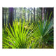Backlit Sägen Palmetto Fronds dominieren die Szene, während die Sonnenstrahlen an einem heißen Sommertag in Georgien die Baumkronen durchstreifen.