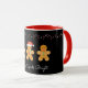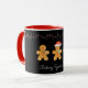 Niedliche Abbildung von drei Lebkuchenmännern in Ferienkleidung. Weihnachtsmannmütze, Winterschals und niedliche bunte Knöpfe sorgen für ein fröhliches Urlaubserlebnis. Die Lebkuchenmänner sind ein wesentlicher Bestandteil der Weihnachtszeit, und dieses Design ist perfekt, um in dieser Saison zu jubeln!