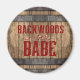 Cooler Kühlschrankmagnet für die Lebenden' das Landleben zeigt "Backwoods Babe" bedrückten dunkelroten Text mit extravagantem blüh auf einem Whiskey-Keg Hintergrund.