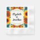 Elegantes und farbenfrohes Blumendesign für einen Hinterhofsommer. Aquamarine blaue Rose, weiße Gänse, rote Wildblumen und Sonnenblumen mit goldfarbenem geometrischem Rahmen