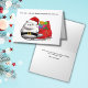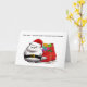 Alberne Weihnachtskarte mit einer Katze mit einer schlechten Einstellung, mit einer Weihnachtsmannmütze und stehend vor einem Sack von Geschenken. Inside Messaging lautet derzeit: "Ich mache keine Kohle, aber ich habe Ihnen etwas in der Abfallbox verlassen." Aktualisieren Sie den gesamten Text einfach.