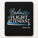 Badass Flight Attendant Personalisiert Black Mouse Pad. Dieses scharf aussehende Design zeigt ein "Badass" fließendes blaues Farbverlaufsskript über den weißen, serifenlosen Schriftart "Flight Attendant". Die Silhouette eines Flugzeug schmilzt unter der Formulierung mit Spuren von Blau und Weiß. Dieses schlichte und dennoch elegante Design ist ein wunderschönes personalisiertes Geschenk für Ihre Flugbegleiterfreunde!