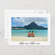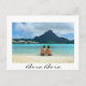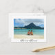 Postkarte mit einem Hochzeitspaar am weißen Sandstrand eines luxuriösen Bungalow Resorts in der klaren blauen Lagune der tropischen Insel Bora Bora, in der Nähe von Tahiti im pazifischen Archipel Französisch-Polynesien.