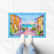 Die hübsche Strandtore-Matte bietet ein Badedorf mit bunten, zweistöckigen Zuhause, Blume und Segelbooten bei Sonnenuntergang.