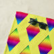 Diamante Formen mit Regenbogenfarben von oben bis unten (grün, gelb, orange, rot, rosa, lila, blau). Diamanten auf einem gelben Hintergrund geben optische Täuschung von Gitterarbeit mit Regenbogen hinten.