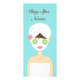 Desteis niedliche Cartoon-Illustration einer brünetten Frau, die ein Handtuch auf ihrem Kopf und Körper trägt und eine weiße Gesichtsmaske auf ihrem Gesicht hat, mit Gurken auf ihren Augen und einer rosa Blume am Ohr. Die Hintergrundfarbe ist weich hellblau mit einem niedlichen Polka-Punktmuster. Auf der anderen Seite der Karte befinden sich anpassbare Textbereiche für Serviceoptionen. Dieses Produkt ist ideal für einen Tag Wellness-Center, Wellness-Center Resort, Schönheitssalon, Kosmetologe oder zum Beispiel für einen Masseuse/Massagetherapeuten.