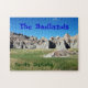 Die natürliche Schönheit der Badlands wird in diesem Foto gezeigt. Der Badlands Nationalpark liegt in Süddakota und ist ein geologisches Wunder von erodierenden Gesäß, Spitzen und Spitzen. Farbenfrohe Gesteinsschichten geben den Panoramablick auf die zerklüftete Landschaft aus, da die Sonne Schatten spendet, die die Spalten, Risse und Risse füllen. Parallel gestreifte und aufgereihte Felsen zeichnen die Landschaft in Rot-, Braun-, Tan- und Graufarben ab, was zu einem spektakulären Blick auf das felsige Gesteinswesen führt. Im Vordergrund ist das Grün der Mischgrasprairie des Nationalgraslands sichtbar. Spuren von weißen Wolken kann man in einem klaren blauen Himmel sehen.