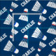 Badminton-Schlägersport wiederholt personalisiertes Shuttlecck-Muster sporting Design Stoff. Weißer Shuttleservice mit blauem oder rotem Band mit blauer Hintergrundfarbe, der bei Bedarf geändert werden kann. Ideal für Badminton-Fans. Anpassen mit Ihrer eigenen Wahl des Namens, derzeit liest Charlie. Kunst und entworfen von Sarah Trett.