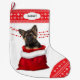 Die Vorderseite dieses Holiday Strumpfs zeigt ein Bild eines bezaubernden deutschen Shepherd Welpen, der aus einem rot-weißen Weihnachtsgeschenksack guckt. Hinter dem Hund befindet sich eine rot beattelte Garage. Zehe und obere Grenze sind ein rotes und weißes Schneeflockenmuster. An der oberen Grenze befindet sich ein weißes Etikett mit dem eigenen Text in dunkelgrau. Die Rückseite des Strumpfs ist das gleiche rote und weiße Schneeflockenmuster.